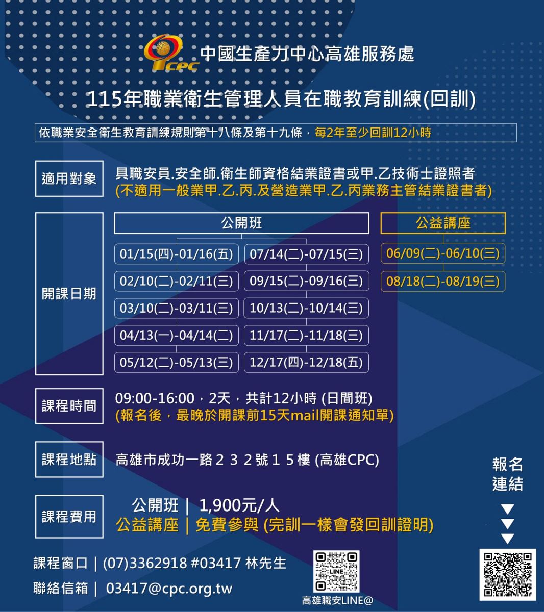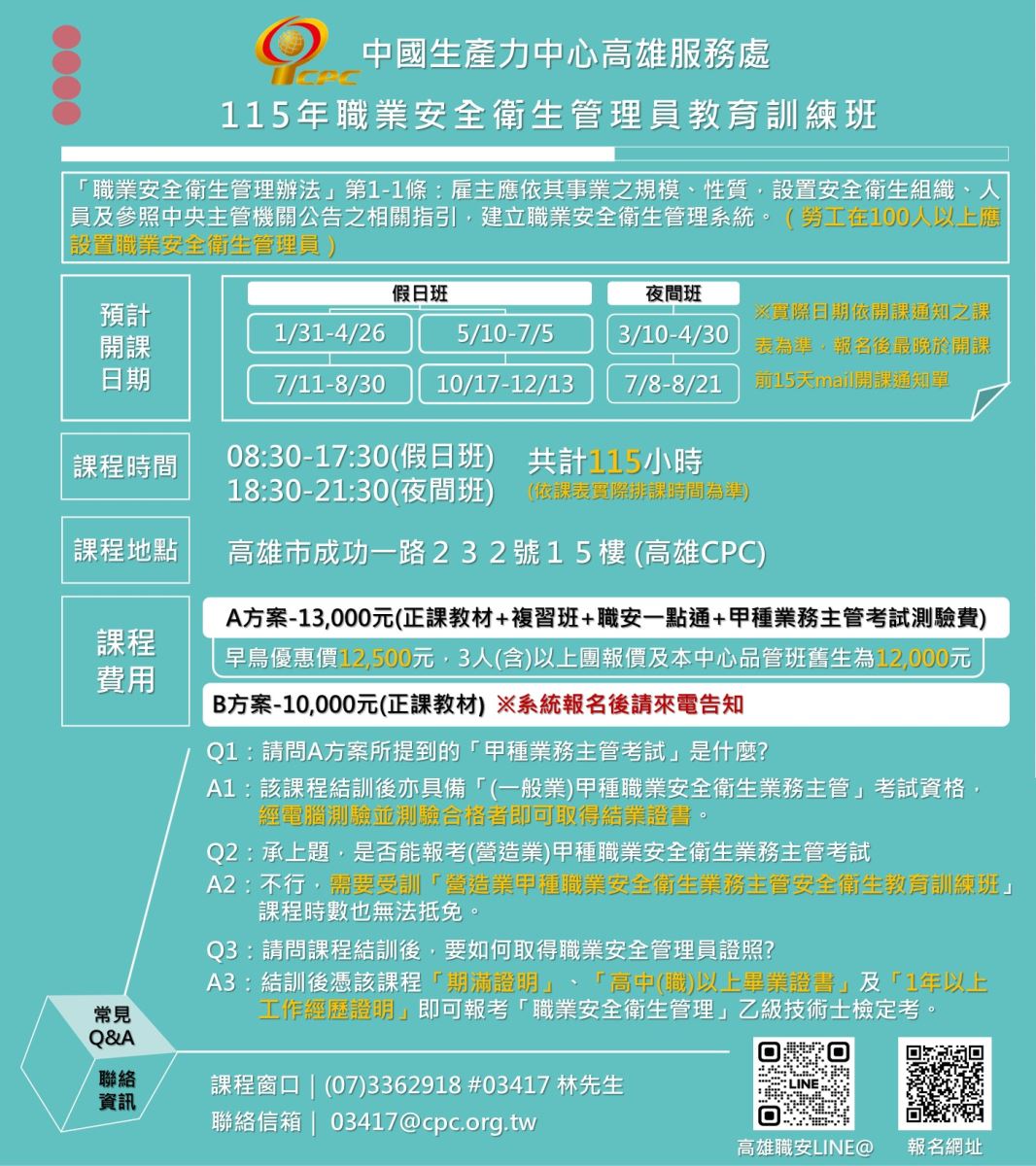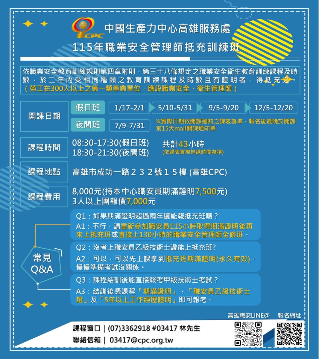 115年度-職業安全衛生管理員(初回訓)及職業安全衛生管理師抵充班總覽出爐,歡迎報名!!