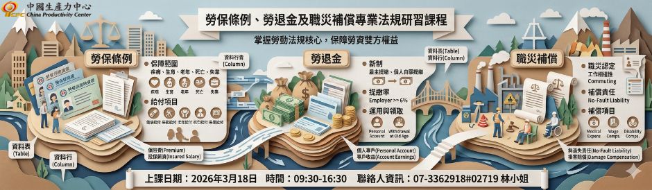 此課程講師為企業主與人資量身打造「TC8625 勞保條例、勞退金及職災補償專業法規研習課程」。帶您深入淺出搞懂複雜法規,有效應對職場中可能面臨的勞保、勞退及職災問題,促進工作場所的權益維護!