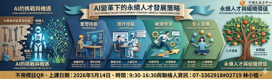 AI 正以前所未有的速度重塑產業與勞動市場,企業所需的技能組合與學習模式也隨之改變。面對這波變革,如何解決「人才斷層」並打造「永續人才體系」,已成為企業保持競爭力的絕對關鍵!此課程帶領您全面掌握 AI 時代的人才發展方向,建立兼具數位力、學習力與永續力的人才藍圖,推動組織持續進化!
